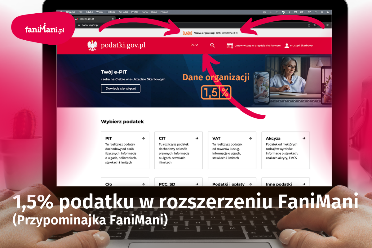 Przypominajka FaniMani to wtyczka do przeglądarek internetowych, która ułatwia przekazywanie darowizn od zakupów w internecie. Rozszerzenie to zostało rozbudowane także o funkcje wspierające zbieranie 1,5% podatku. Dzięki temu każda organizacja korzystająca z FaniMani może dotrzeć z informacją o 1,5% podatku dokładnie w momencie, gdy podatnik wypełniania PIT albo wyszukuje informacje na temat rozliczenia PIT.