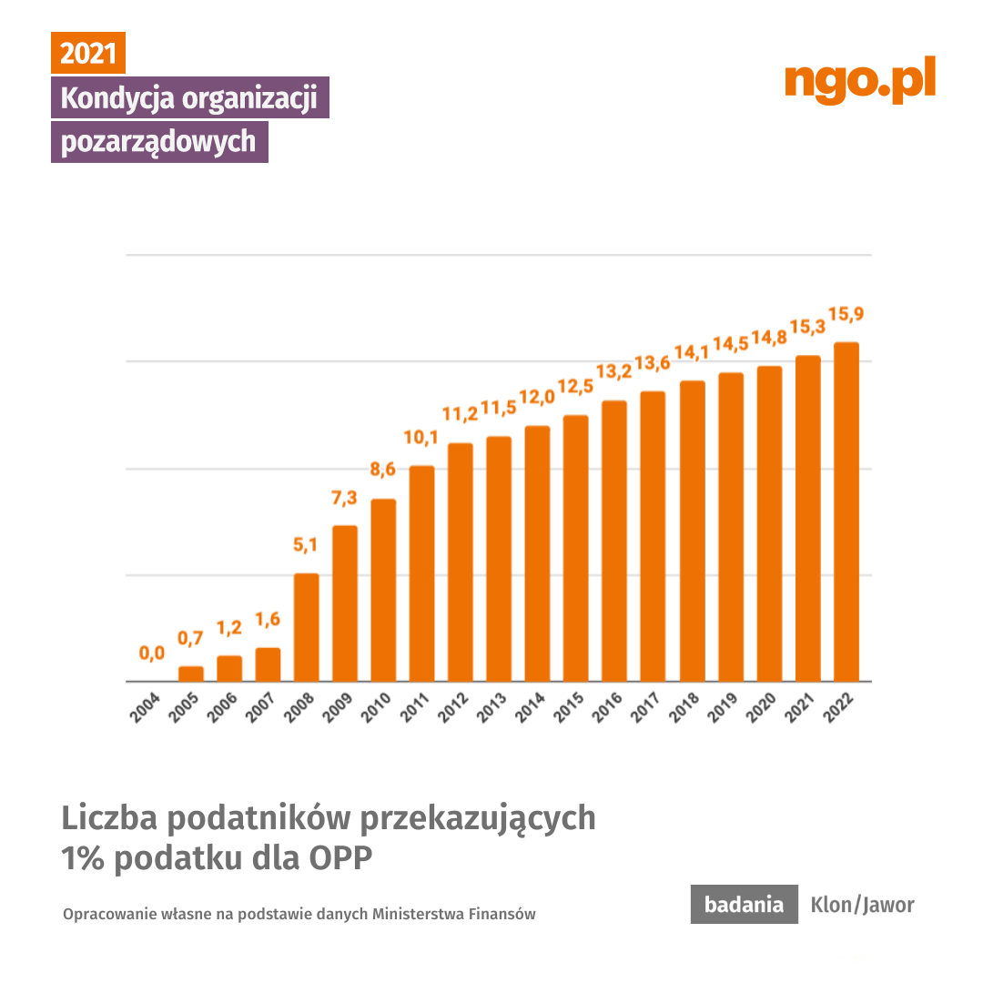 15,9 mln osób przekazało 1% swojego podatku dochodowego na cele społeczne. To oznacza, że o około 0,6 mln osób zwiększyła się pula podatników korzystających z mechanizmu 1-procentowego. W Polsce podatek dochodowy PIT płaci ok. 22 mln osób, co oznacza, że ok. 70% podatników korzysta z możliwości wsparcia organizacji społecznych przy okazji rozliczania swojego podatku dochodowego.