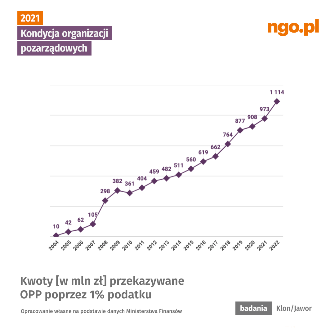Organizacje pożytku publicznego zebrały z podatków płaconych za 2021 rok rekordową kwotę 1 miliarda 114 milionów złotych. To o 141 milionów więcej niż w roku poprzednim.