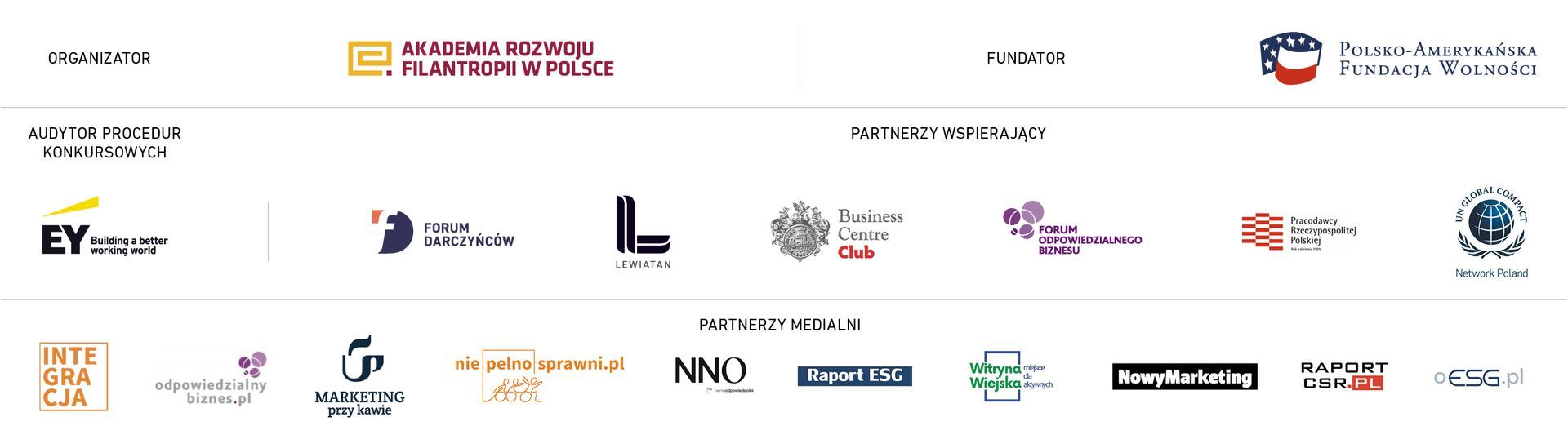 Patroni medialni: magazyn „Raport ESG” oraz portale: odpowiedzialnybiznes.pl, portal ngo.pl, RaportCSR.pl, oesg.pl, Marketing przy Kawie, niepełnosprawni.pl, NowyMarketing.pl, witrynawiejska.pl i blog NNO (Nienieodpowiedzialni).