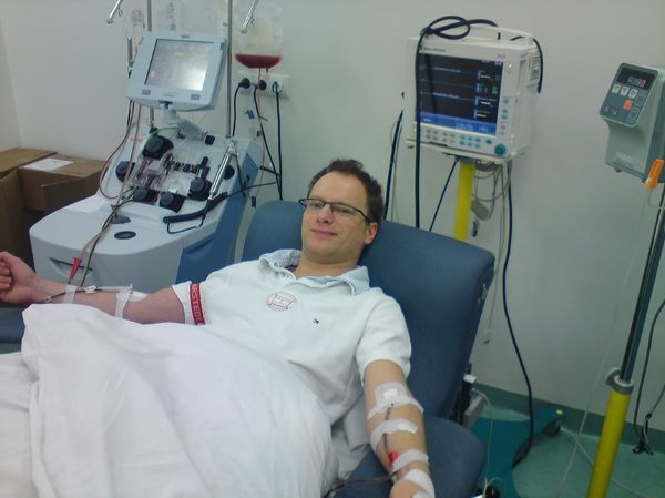 – Miałem wtedy bardzo napięty okres, grałem z teatrem za granicą. Nie mogłem pozwolić sobie na zejście ze sceny. Czułem się słabiej, ale nie było to coś, czego nie można wytrzymać – opowiada. – Dzień zabiegu? Nakłucie, jak przy pobraniu krwi, a potem pięć godzin nieruchomo w fotelu. Koniec. Nie jest to może przysłowiowe ”wąchanie fiołków” i zabieg wyjątkowo komfortowy, ale o czym my w ogóle rozmawiamy, jeśli na szali jest czyjeś życie – podkreśla.