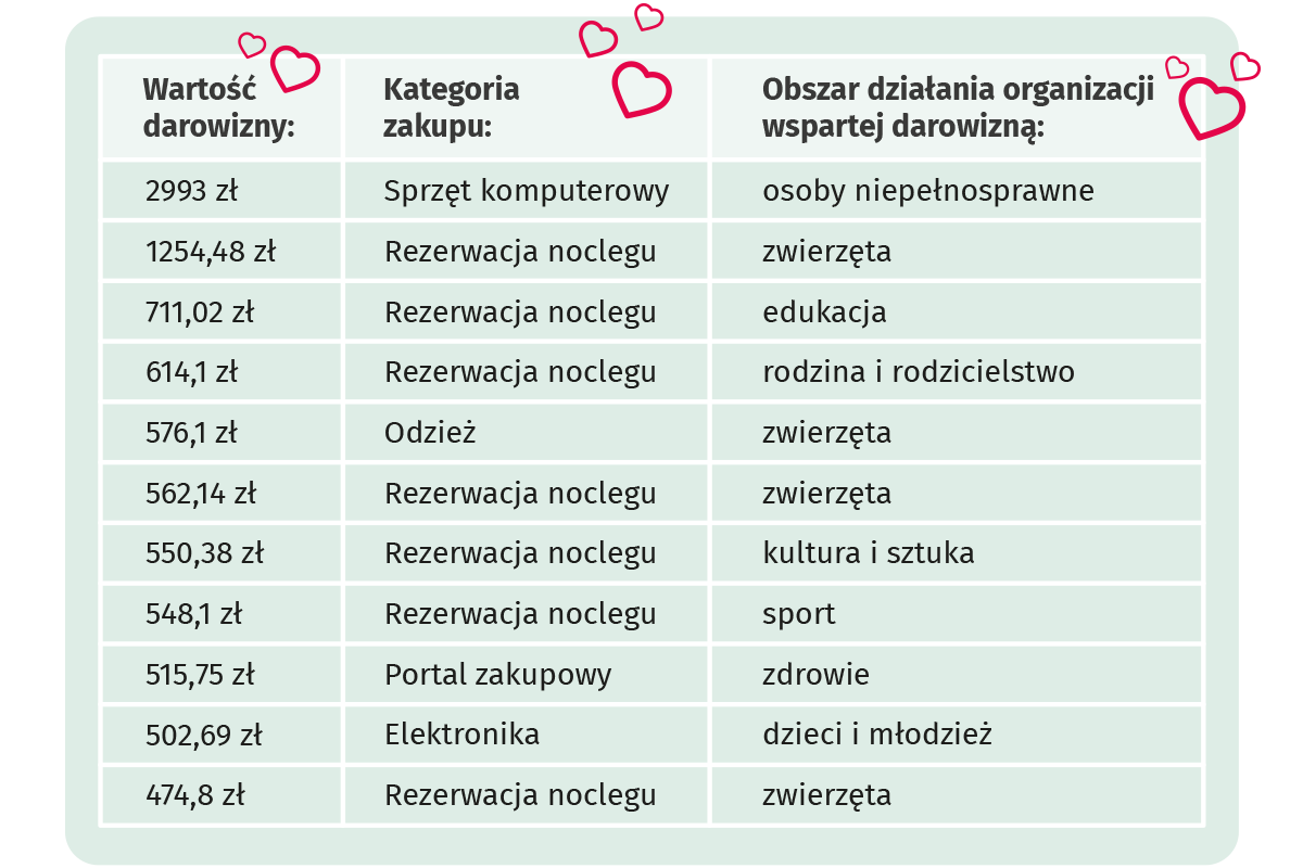 Z kolei największa jednorazowa darowizna od rezerwacji noclegu wyniosła ponad 1200 zł za rezerwację hotelu i sali konferencyjnej dla firmy.