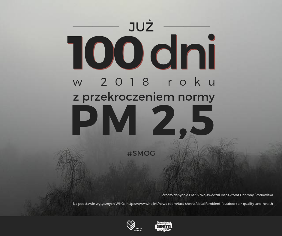 W tym roku Wrocław „uzbierał” już ponad 100 dni z przekroczeniami normy dobowej WHO dla pyłów PM2,5. To najdrobniejsza, a zarazem najbardziej niebezpieczna dla zdrowia frakcja zanieczyszczeń powietrza. Społecznicy z Akcji Miasto i Dolnośląskiego Alarmu Smogowego przeanalizowali dane z poprzednich lat. Sytuacja wygląda dramatycznie – dni z przekroczeniami normy dla PM2.5 mieliśmy: 106 w 2015 r., 118 w 2016 r., 92 w 2017 r. oraz 100 w tym roku.