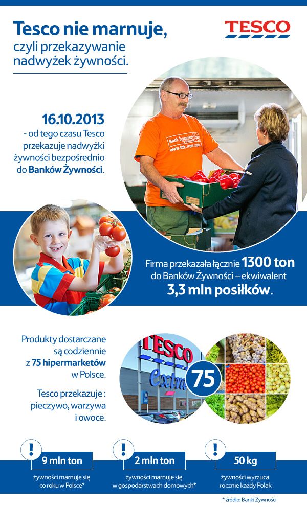 Równo dwa lata temu – 16 października 2013 roku – Tesco rozpoczęło swój autorski program przekazywania nadwyżek żywności bezpośrednio ze sklepów do lokalnych Banków Żywności. Dziś produkty spożywcze przekazuje 75 największych hipermarketów sieci. Łącznie do podopiecznych Banków Żywności trafiło ponad 1300 ton produktów - ilość wystarczająca do przygotowania 3,3 mln posiłków. Chcąc przewieźć jednorazowo wszystkie przekazane produkty, potrzebowalibyśmy 55 samochodów ciężarowych.