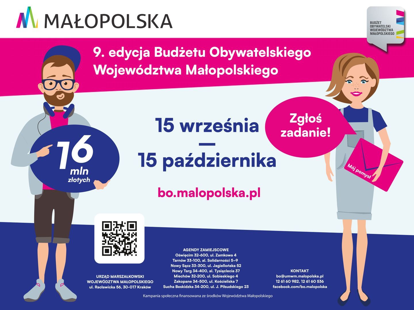 Od 15 września do 15 października trwa nabór zadań do 9. edycji Budżetu Obywatelskiego Województwa Małopolskiego. Wystarczy pomysł oraz 30 podpisów na liście poparcia! Weź sprawy w swoje ręce!