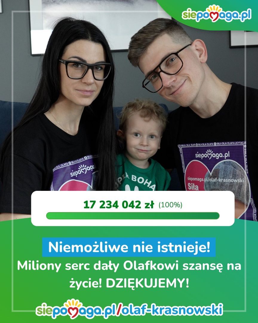 – Gdy na pasku zbiórki pojawiło się upragnione 100%, nasze serca przepełniły wzruszenie i wdzięczność - napisali rodzice Olafka. To wszystko wydarzyło się dzięki pomocy dobrych ludzi i wierze, że razem możemy dokonać niemożliwego. Olafek dostał szansę, na którą każde dziecko zasługuje – szansę na zdrowie, na życie, na przyszłość.