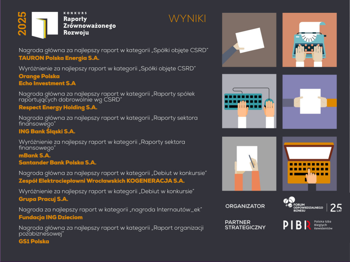 24 listopada na GREENPACT w Poznaniu odbyła się gala finałowa 19. edycji konkursu “Raporty Zrównoważonego Rozwoju”, organizowanego przez Forum Odpowiedzialnego Biznesu. Podczas gali ogłoszono zwycięskie i wyróżnione raporty w sześciu kategoriach. W konkursie udział wzięło 77 publikacji. Partnerem Strategicznym konkursu jest Polska Izba Biegłych Rewidentów.