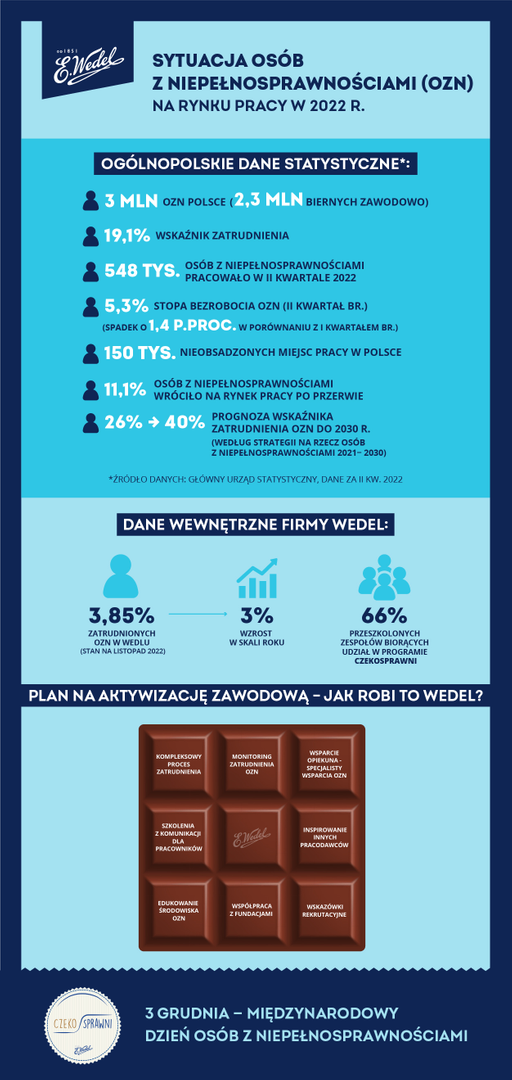 – Od startu programu w 2021 roku do października br. do naszej firmy dołączyło kilkanaście osób z niepełnosprawnościami w ramach nowo utworzonych wakatów, a poziom zatrudnienia OzN w skali roku wzrósł z niecałego 1% do 3,85%. Zatrudniamy w różnych częściach biura, jak i w fabryce. Systematycznie szkolimy też pracowników wszystkich szczebli oraz nowe osoby w organizacji w zakresie komunikacji włączającej i savoir-vivre'u w pracy z osobami o szczególnych potrzebach. Do dziś szkolenie przeszło 66% zespołów biorących udział w programie, a do końca marca 2023 r. planujemy osiągnąć 100% – wylicza Aleksandra Kusz vel Sobczuk, Kierowniczka Komunikacji Korporacyjnej w firmie Wedel.