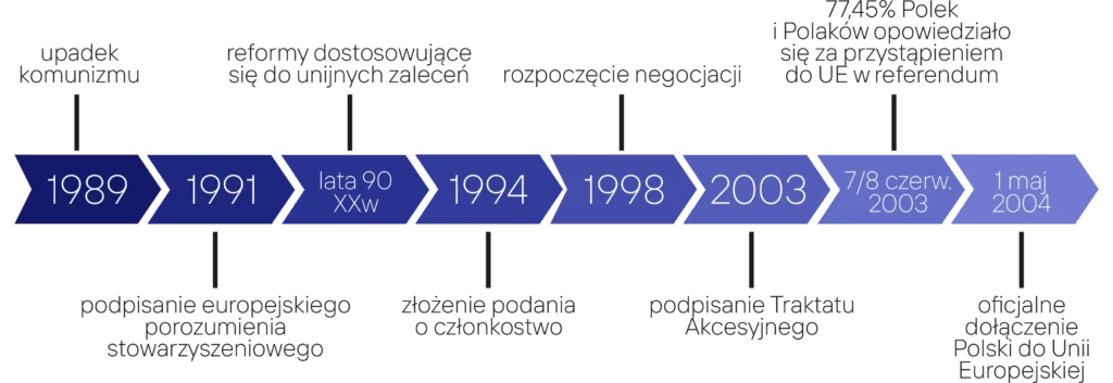W latach 90. XX wieku przeprowadzono szereg reform, dostosowując się do standardów UE. Oficjalne podanie o członkostwo złożono w 1994 roku, a negocjacje rozpoczęły się w 1998. Po kilkuletnich negocjacjach podpisano Traktat Akcesyjny w 2003 roku, potwierdzając przystąpienie Polski do UE. To wydarzenie otworzyło nowe perspektywy rozwoju gospodarczego, politycznego i społecznego dla kraju. Referendum na temat przystąpienia Polski do Unii Europejskiej odbyło się 7 i 8 czerwca 2003 roku. W wyniku głosowania, 77,45% Polaków opowiedziało się za przystąpieniem do UE. Polska oficjalnie dołączyła do Unii Europejskiej 1 maja 2004 roku.
