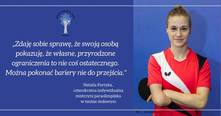 Zdaję sobie sprawę, że swoją osobą pokazuję, że własne, przyrodzone ograniczenia to nie coś ostatecznego. (…) Można pokonać bariery nie do przejścia - mówi Natalia Partyka, mistrzyni Polski, świata, czterokrotna indywidualna mistrzyni paraolimpijska w tenisie stołowym.