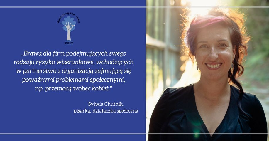 Brawa dla firm podejmujących swego rodzaju ryzyko wizerunkowe, wchodzących w partnerstwo z organizacją zajmującą się poważnymi problemami społecznymi, np. przemocą wobec kobiet – mówi Sylwia Chutnik, pisarka, kulturoznawczyni, feministka, działaczka społeczna, laureatka Paszportu Polityki, kieruje Fundacją MaMa, zajmującą się prawami matek.