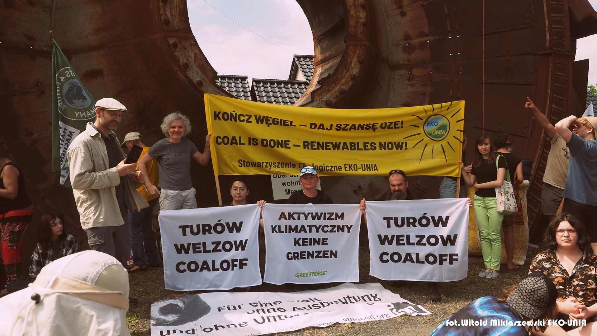 Rozwijamy nasze transparenty. EKO-UNIA w kolorze żółto-czarnym: „Kończ węgiel. Wspieraj OZE!” (po polsku i angielsku), Fundacja RT-ON: „Węgiel zostawicie pod ziemią”, Greenpeace: „TURÓW, WELTZOW, COAL OFF”.