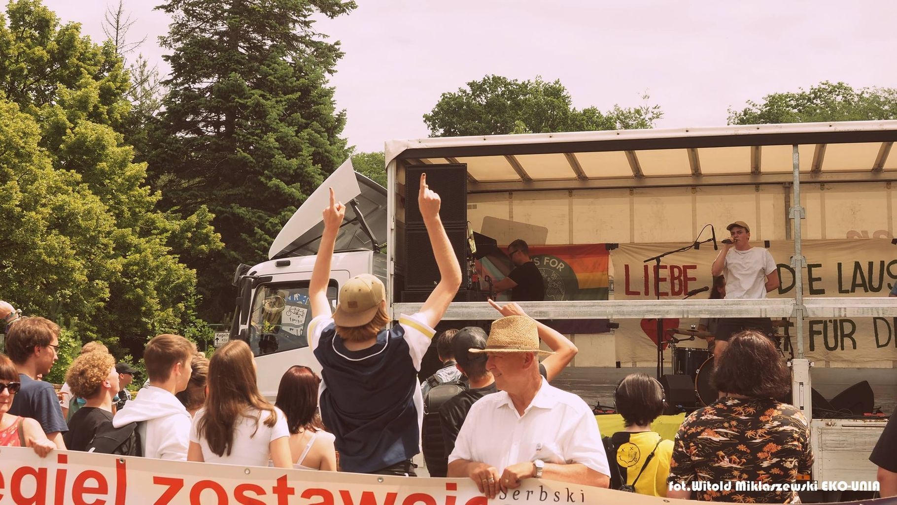 Wydarzenie rozpoczyna się ok. 45-minutowym koncertem rockowej grupy. Ciekawe, bo zwykle takie koncerty bywały na koniec imprezy. Dobrze grają, to nie amatorzy. Rytmiczna, energetyzująca muzyka. Lider śpiewa niebanalne teksty o zagrożeniu przyrody, klimatu i ludzi, o gubieniu miłości, zagrożeniu ze strony „nazi”, ale też o nadziei. Część demonstrantów, też nasza koleżanka z Greenpeace (!), tańczy „pogo” pod sceną. Podnosi się aż kurz.