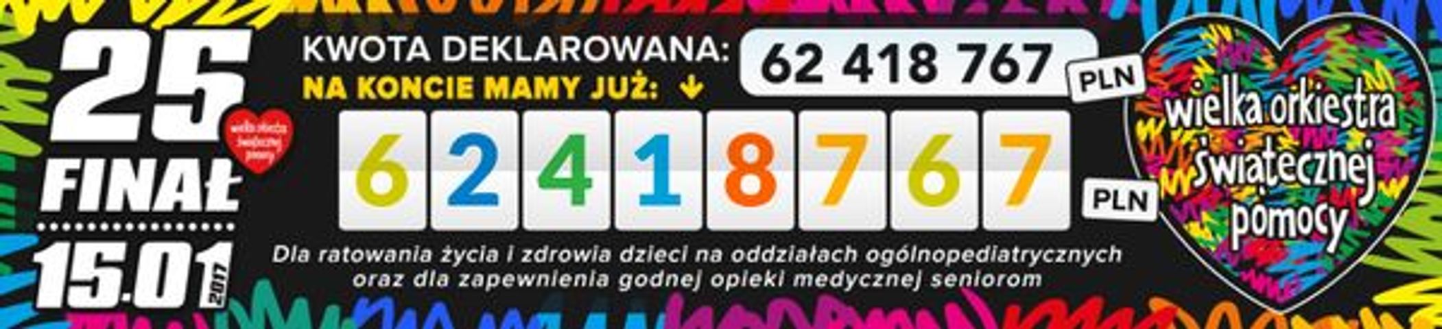 W piątek, 27 stycznia, o godzinie 15:00 stan konta bankowego 25. Finału WOŚP przekroczył kwotę deklarowaną w dniu Finału. Oznacza to, że zaledwie 12 dni po zbiórce kwota uzyskana poprzez kanały elektroniczne oraz kwota zbiórki policzona przez bank i przekazana na rachunek zbiórki wynosi w sumie ponad 62.418.767.