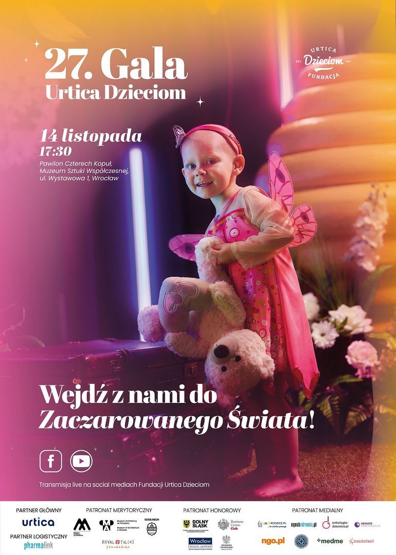 Dwudziesta siódma Gala Urtica Dzieciom odbędzie się 14 listopada o godzinie 17:30 w Pawilonie Czterech Kopuł we Wrocławiu. To uroczyste, coroczne wydarzenie, na którym odbywa się licytacja prac Młodych Artystów, pacjentów osiemnastu oddziałów onkologii i hematologii dziecięcej w całej Polsce.