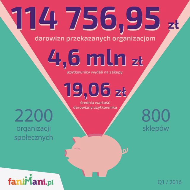Po pierwszym kwartale 2016 roku do organizacji społecznych trafiło ponad 114 750 zł w ramach darowizn zebranych przez FaniMani.pl. Użytkownicy serwisu łącznie wydali 4,6 mln zł na „dobre zakupy” w 800 sklepach. Średnia wartość wygenerowanej darowizny przekroczyła 19 zł.