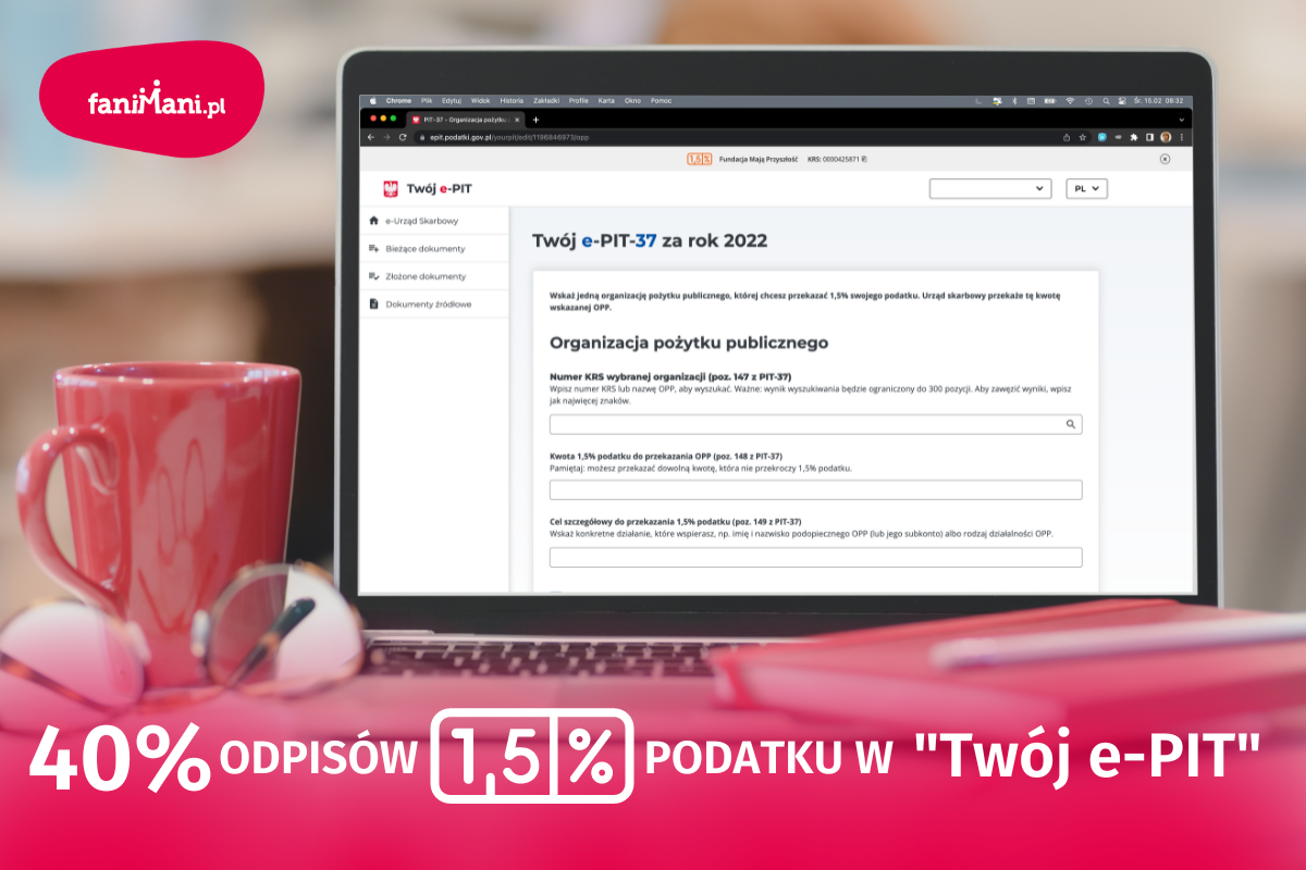 Zwiększ szanse swojej organizacji, na dotarcie z informacją o 1,5% podatku, w momencie gdy właśnie podatnik rozlicza swój PIT – zarejestruj organizację na FaniMani.pl i skonfiguruj 1,5% podatku w Panelu Organizacji.