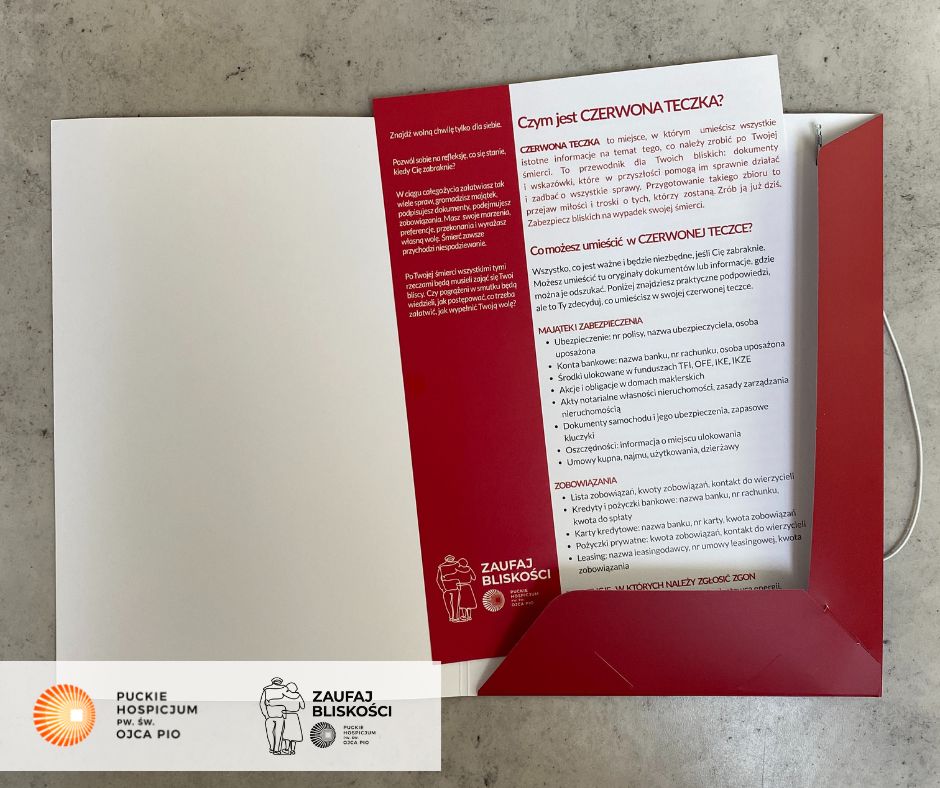 Czerwona teczka to przewodnik dla naszych bliskich, który w przyszłości pomoże im sprawnie działać i zadbać o wszystkie sprawy. Przygotowanie takiego zbioru dokumentów i innych istotnych informacji pomaga w postąpieniu zgodnie z naszą wolą, ale jest również przejawem miłości i troski o tych, którzy zostaną. Więcej informacji o ważności ostatniej woli, wzór oświadczenia oraz wskazówki jak stworzyć Czerwoną Teczkę, można znaleźć w drugiej edycji Raportu o Dobrym Umieraniu: Zaufaj bliskości. Zebrany w nim materiał został stworzonego na podstawie wyników badań opinii oraz pracy ekspertów Puckiego Hospicjum. Bezpłatny dostęp do jego elektronicznej wersji znajduje się w linku: www.hospitium.org/raport.