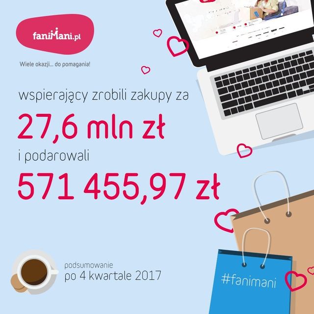 Przygotowaliśmy podsumowanie pomagania przy okazji zakupów na FaniMani.pl po czwartym kwartale 2017 r. Łączna suma darowizn od zakupów wyniosła 571 455,97 zł. Użytkownicy serwisu FaniMani.pl wydali na dobre zakupy już przeszło 27,6 mln zł!