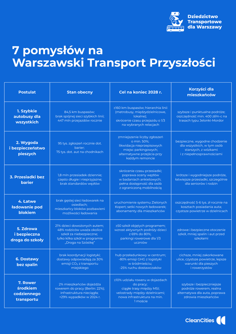 „7 pomysłów na Warszawski Transport Przyszłości” zostało opracowanych i popartych przez 18 warszawskich organizacji społecznych, w tym Clean Cities Campaign. To gotowy i kompleksowy przepis na to, jakie zmiany należy wprowadzić, aby w ciągu trzech lat stołeczny transport stał się symbolem wygody, zdrowia i bezpieczeństwa, a Warszawa była prawdziwie nowoczesną metropolią.