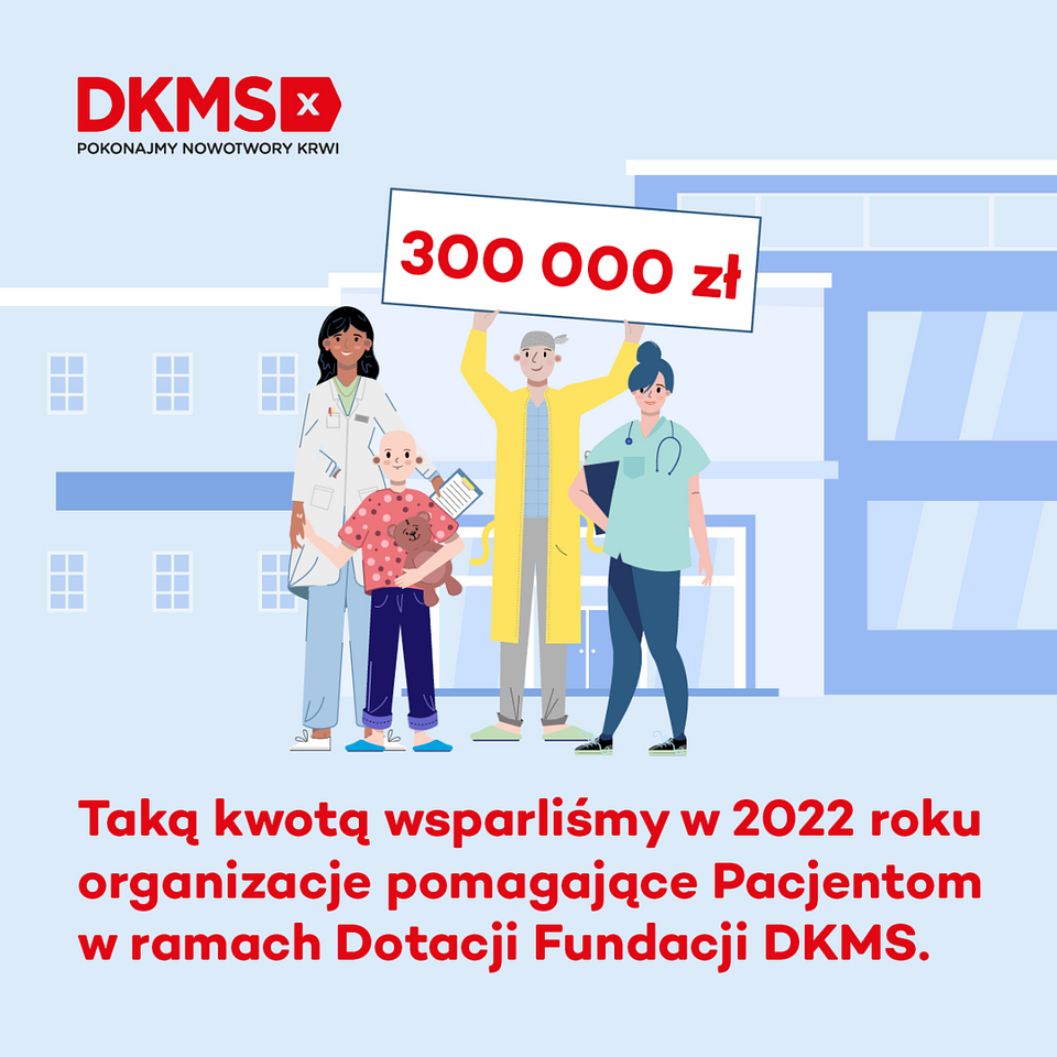 W 2022 roku w ramach programu fundacja rozpoczęła również nową inicjatywę – Dotację Fundacji DKMS, która skierowana jest do organizacji działających na rzecz pacjentów cierpiących na nowotwory krwi i choroby układu krwiotwórczego. Jej celem jest pomoc psychologiczna pacjentom w każdym wieku oraz ich bliskim, zarówno w trakcie leczenia, jak i podczas procesu powrotu do zdrowia. Pula dotacji na projekty organizacji pacjenckich wyniosła 350 tys. zł. Inicjatywa spotkała się z dużym zainteresowaniem organizacji – zgłoszono aż 18 projektów, spośród których 6 organizacji otrzymało dotację na realizację projektów pomocowych.