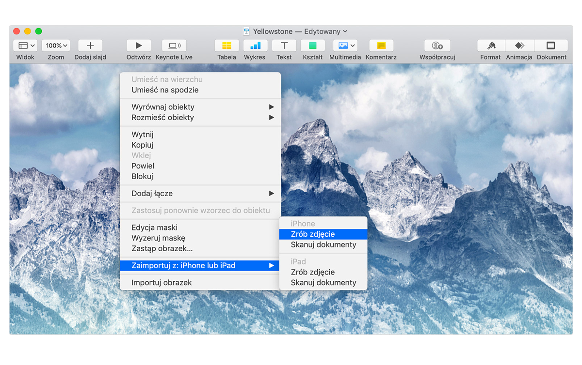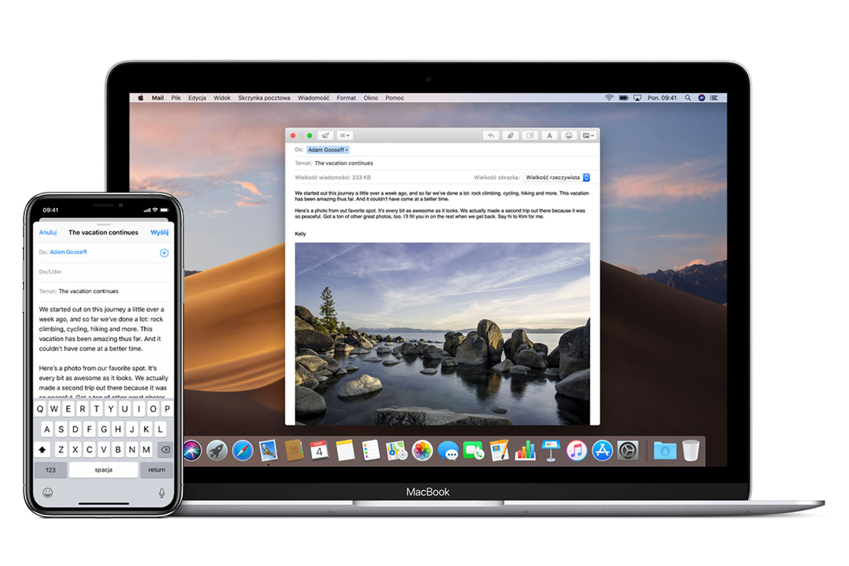 Wcześniej opisane Uniwersalny schowek i AirDrop pozwalają na szybkie i wygodne przesyłanie zawartości między urządzeniami. Ale dzięki funkcji Continuity nie musimy nic przesyłać! Wystarczy, że na Macu (np. w programie pocztowym Mail) wybierzesz opcję Wstaw zdjęcie, a Twój iPhone/iPad uruchomi aparat. Po wykonaniu zdjęcia natychmiast znajdzie się ono w treści tworzonej wiadomości. W ten sam sposób możesz też skanować dokumenty.