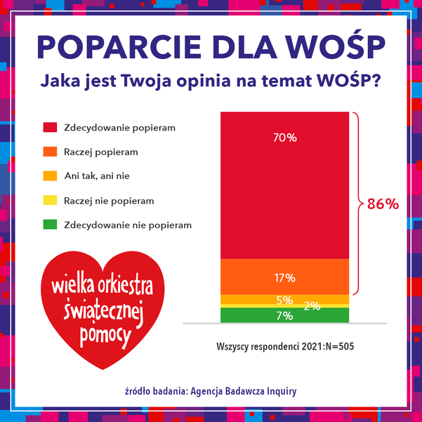 Wizerunek organizacji jest coraz silniejszy, a poparcie dla Orkiestry bardzo wysokie – aż 86% badanych popiera działania Fundacji, co stanowi wynik wyższy w porównaniu z ubiegłym rokiem, gdy poparcie deklarowało 79% ankietowanych. Co istotne, większość uczestników ankiety - 85% - uważa, że dzięki WOŚP uratowano życie lub zdrowie wielu pacjentów, a aż 8 na 10 Polaków jest dumnych, że taka akcja ma miejsce w Polsce. Ponadto ¾ ankietowanych uznaje WOŚP za najlepszą akcję charytatywną w naszym kraju.