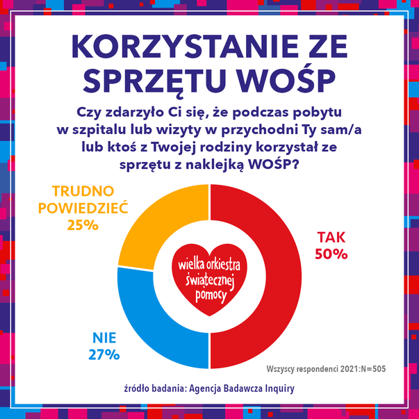 Wśród pytań, na które odpowiadali uczestnicy badania, pojawiło się: „Czy zdarzyło Ci się, że podczas pobytu w szpitalu lub wizyty w przychodni Ty kub ktoś z Twojej rodziny korzystał ze sprzętu z naklejką WOŚP?”. Twierdzącej odpowiedzi udzieliła połowa ankietowanych – to nieznacznie więcej (o 2%) niż przed rokiem.