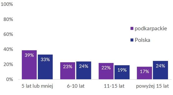 Organizacje pozarządowe z województwa podkarpackiego są nieco młodsze niż te działające w całym sektorze. 39% stowarzyszeń i fundacji z Podkarpacia działa nie dłużej niż 5 lat, w całej Polsce jest to 33%. Z kolei powyżej 15 lat ma 17% organizacji z podkarpackiego, podczas gdy w całym sektorze jest ich o 7 punktów procentowych więcej.
