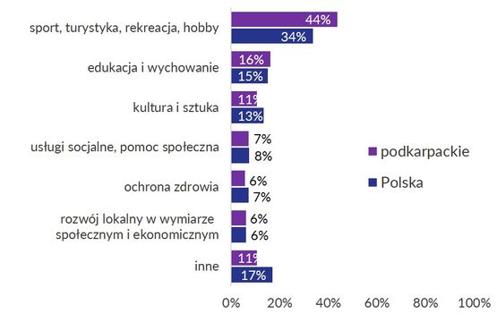 Organizacje w województwie podkarpackim częściej zajmują się sportem, turystyką, rekreacja i hobby – stanowią one w tym regionie 44% wszystkich stowarzyszeń i fundacji, o 10 punktów procentowych więcej niż w całym sektorze. Nie powoduje to jednak znaczącego zmniejszenia (w stosunku do proporcji w całym sektorze) udziału w podkarpackim sektorze organizacji działających w innych spośród najliczniej reprezentowanych branż sektora: edukacyjnej, kulturalnej, pomocowej, działającej na rzecz ochrony zdrowia czy rozwoju lokalnego. Mniej (o 6 punktów procentowych) jest za to na Podkarpaciu organizacji aktywnych w dziedzinach zaliczanych do kategorii „inne”.