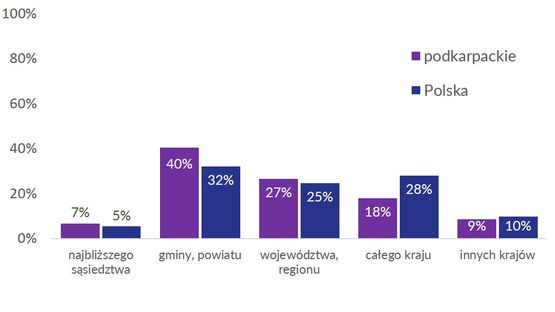 Na Podkarpaciu organizacje są bardziej lokalne niż w całej Polsce. Niemal połowa organizacji (47%) działa w skali nie większej niż gmina lub powiat (w całym sektorze jest ich o 10 punktów procentowych mniej – 37%). Odpowiednio mniej jest w opisywanym regionie organizacji obejmujących swoim oddziaływaniem cały kraj – na Podkarpaciu stanowią 18% wszystkich stowarzyszeń i fundacji, a w całym kraju 28%.