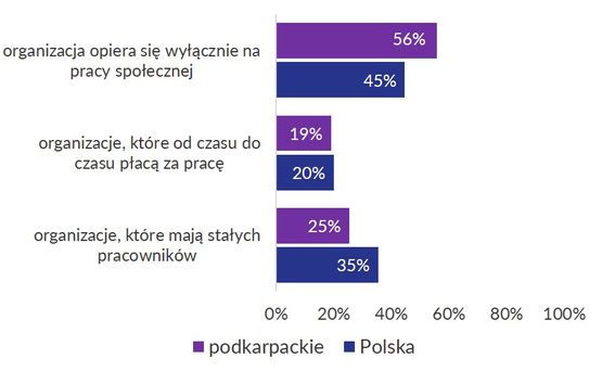 Ponad połowa (56%) stowarzyszeń i fundacji z województwa podkarpackiego działa wyłącznie społecznie, nie zatrudniając żadnego personelu (w całym sektorze jest ich o 11 punktów procentowych mniej). W kolejnych 19% podkarpackich NGO nie ma stałego płatnego personelu, ale sporadycznie wypłacane jest wynagrodzeniu jednemu lub kilkorgu współpracowników. Co czwarta organizacja (25%) na Podkarpaciu (a 35% w całym kraju) zatrudnia co najmniej jedną osobę na stałe.