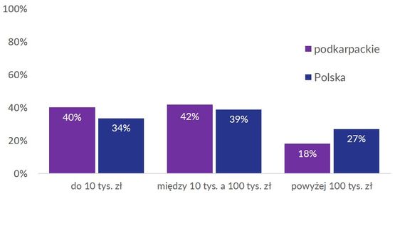 Na Podkarpaciu jest mniej (o 9 punktów procentowych) organizacji o przychodach przekraczających 100 tys. zł – takim budżetem może pochwalić się 18% organizacji z opisywanego województwa i 27% całego sektora. W konsekwencji więcej było zarówno stowarzyszeń i fundacji o najniższych przychodach (do 10 tys. zł) – w podkarpackim 40%, a w całym sektorze 34%, jak i tych o budżetach między 10 tys. a 100 tys. zł (na Podkarpaciu 42%, a w całej Polsce 39%).