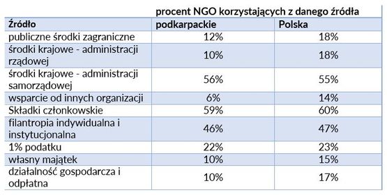 Z większości dostępnych dla organizacji pozarządowych źródeł finansowania stowarzyszenia i fundacje z podkarpackiego korzystają rzadziej niż NGO w całym kraju. Znaczącą różnicę między opisywanym województwem a całym sektorem widać w wykorzystaniu publicznych środków zagranicznych (w podkarpackim przychody z tego źródła miało 12%, w całym sektorze 18%), dotacji z administracji rządowej (odpowiednio 10% vs. 18%), wsparcia od innych organizacji (6% vs. 14%), przychodów z własnego majątku (10% vs 15%) oraz działalności odpłatnej i gospodarczej (10% vs 17%).