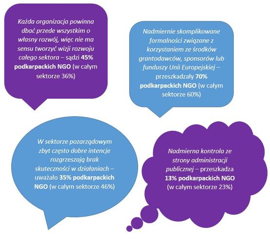 Opinie i problemy, które wyróżniają podkarpacki sektor pozarządowy świadczą o dużym zagubieniu organizacji z tego rejonu w gąszczu procedur i formalności związanych z korzystaniem ze środków grantodawców i sponsorów – są one problemem dla 70% (być może stąd mniejsza gotowość do korzystania z różnorodnych źródeł przychodów). Jednocześnie podkarpackim stowarzyszeniom i fundacjom nie przeszkadza kontrola ze strony administracji publicznej – narzeka na nią jedynie 13% NGO, podczas gry w całym sektorze o 10 punktów procentowych więcej.