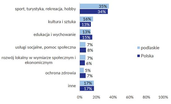 Nieco większy udział organizacji zajmujących się kulturą i sztuką (o 3 punkty procentowe) oraz mniejszy odsetek stowarzyszeń i fundacji aktywnych w obszarze edukacji i wychowania oraz ochrony zdrowia (w obydwu przypadkach po 2 punkty procentowe) – tym dziedziny działalności podlaskich organizacji wyróżniają się na tle ogólnopolskim.