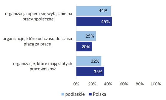 Udział organizacji opierających się wyłącznie na pracy społecznej w podlaskim i ogólnopolskim sektorze jest niemal taka sama (44% vs. 45%). Jednak w opisywanym województwie nieco mniej niż w całej Polsce organizacje mają stałych pracowników (posiada ich 32%, a w całym kraju 35% NGO), za to częściej korzystają z pracy odpłatnej od czasu do czasu lub sporadycznie (na takiej zasadzie działa 25% sektora w podlaskim i 20% ogólnopolskiego).