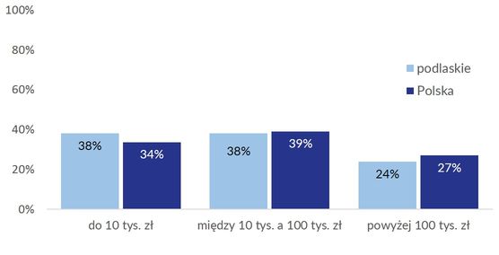 Budżety podlaskich organizacji były w 2014 roku nieco mniejsze niż organizacji w całej Polsce. W opisywanym województwie więcej było stowarzyszeń i fundacji o najniższych przychodach, do 10 tys. zł rocznie (o 4 punkty procentowe), a niemal tyle samo mniej NGO o przychodach powyżej 100 tys. zł (24% stosunku do 39% w całym kraju).