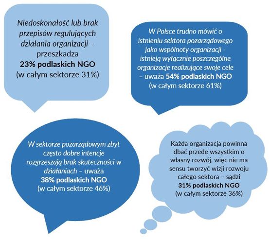 Wydaje się także, że podlaskie stowarzyszenia i fundacje rzadziej są skłonne zgadzać się z opiniami podważającymi wiarygodność organizacji („W sektorze pozarządowym zbyt często dobre intencje rozgrzeszają brak skuteczności w działaniach” – uważa tak 38% podlaskiego sektora i 46% ogólnopolskiego), a także istnienie i sens wspólnych działań całego sektora pozarządowego (rzadziej zgadzają się ze stwierdzeniami: „W Polsce trudno mówić o istnieniu sektora pozarządowego jako wspólnoty organizacji – istnieją wyłącznie poszczególne organizacje realizujące swoje cele” oraz „Każda organizacja powinna dbać przede wszystkim o własny rozwój, więc nie ma sensu tworzyć wizji rozwoju całego sektora”).