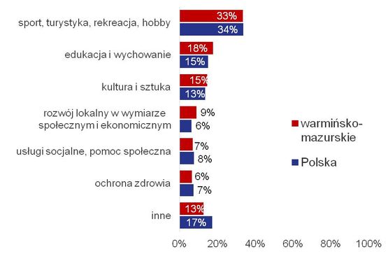 Mniej jest też w warmińsko-mazurskim organizacji działających w „innych”, mniej licznie reprezentowanych dziedzinach (13% vs. 17% w całej Polsce).