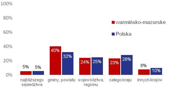Udział organizacji o lokalnym zasięgu jest w województwie warmińsko-mazurskim większy niż w całej Polsce (45% NGO z tego regionu działa w skali nie większej niż gmina/powiat, w całej Polsce 37%), za to mniej jest stowarzyszeń i fundacji o ogólnopolskim zakresie działań (w warmińsko-mazurskim taki obszar oddziaływania deklaruje 23%, w całym sektorze 28%) oraz takich, które są aktywne na terenie innych krajów – w warmińsko-mazurskim jest ich 8%, w całej Polsce 10%.
