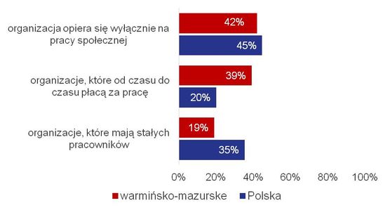 Udział organizacji opierających się wyłącznie na pracy społecznej w województwie warmińsko-mazurskim jest nieco mniejszy niż w całym kraju (42% vs. 45%). Jednak w opisywanym województwie stałych pracowników ma tylko 19% organizacji (w całym kraju 35%), za to niemal dwa razy częściej niż w całej Polsce warmińsko-mazurskie stowarzyszenia i fundacje płacą za pracę na swoją rzecz od czasu do czasu lub sporadycznie (na takiej zasadzie współpracuje z płatnymi pracownikami 39% sektora w warmińsko-mazurskim i 20% w kraju).