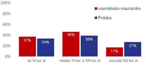 Aż o 10 punktów procentowych mniej było w 2014 roku w województwie warmińsko-mazurskim organizacji o najwyższych budżetach (powyżej 100 tys. zł): w opisywanym województwie stanowiły 17% sektora, a w całym kraju 27%. Jednocześnie odpowiednio większy udział mają w warmińsko-mazurskim sektorze miały organizacje o budżetach średnich (między 10 tys. a 100 tys. zł): 46% w stosunku do 39% w całym sektorze, a także małych (do 10 tys. zł): 37% vs. 34% w całym kraju.