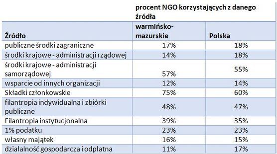 Jednak największą przewagę nad stowarzyszeniami i fundacjami z całej Polski miały warmińsko-mazurskie NGO pod względem korzystania ze składek członkowskich – w swoich budżetach miało je 75% organizacji na Warmii i Mazurach i 60% w całym kraju. Różnica ta związana jest jednak w dużej mierze z innym udziałem stowarzyszeń – w warmińsko-mazurskim jest ich 91%, a w całej Polsce 84%.