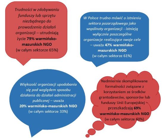 Trudności ze zdobyciem środków finansowych lub sprzętu częściej dotykają warmińsko-mazurskie NGO – narzeka na nie 79% stowarzyszeń i fundacji w opisywanym województwie i 65% w całej Polsce. Jednocześnie problem z nadmiernie skomplikowanymi formalnościami związanymi z korzystaniem ze środków grantodawców i sponsorów także są w tym regionie dla organizacji bardziej dotkliwe – jako dokuczliwe wskazuje je 69% warmińsko-mazurskiego sektora i 60% ogólnopolskiego.