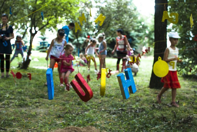 Grupa studentów – Emilia, Marta, Kasia, Adam, Monika, Aneta i Sylwia zorganizowała dziś dzieciom ciekawe zajęcia. Między drzewami rozwiesili sznurki a swoich podopiecznych podzielili na trzy grupy: Czerwoną, Niebieską i Żółtą. Każda drużyna, używając wybranej strategii dążyła do tego, aby na sznurkach znalazło się jak najwięcej liter w ich kolorze, jednocześnie starając się aby składały się one w wyrazy.