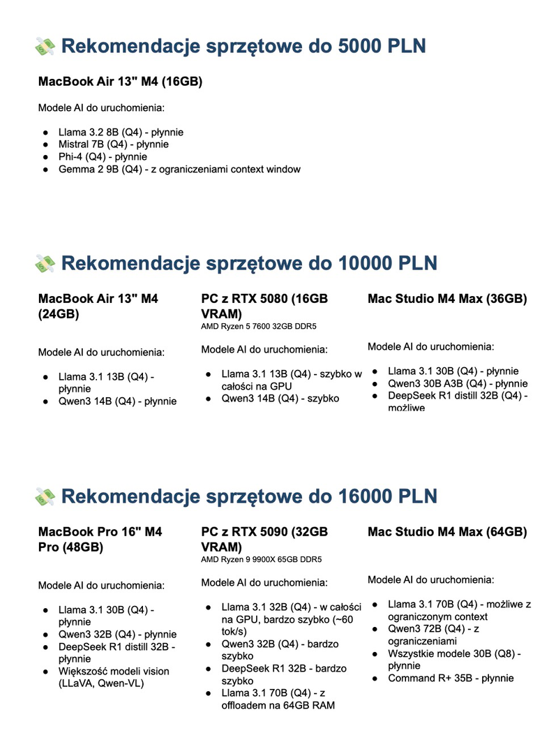 - Wymagania sprzętowe: AI potrzebuje mocnej karty graficznej (GPU) lub komputera z procesorem Apple Silicon (M1-M5). Zwykły laptop biurowy z Windowsem i zintegrowaną grafiką będzie działał bardzo wolno.