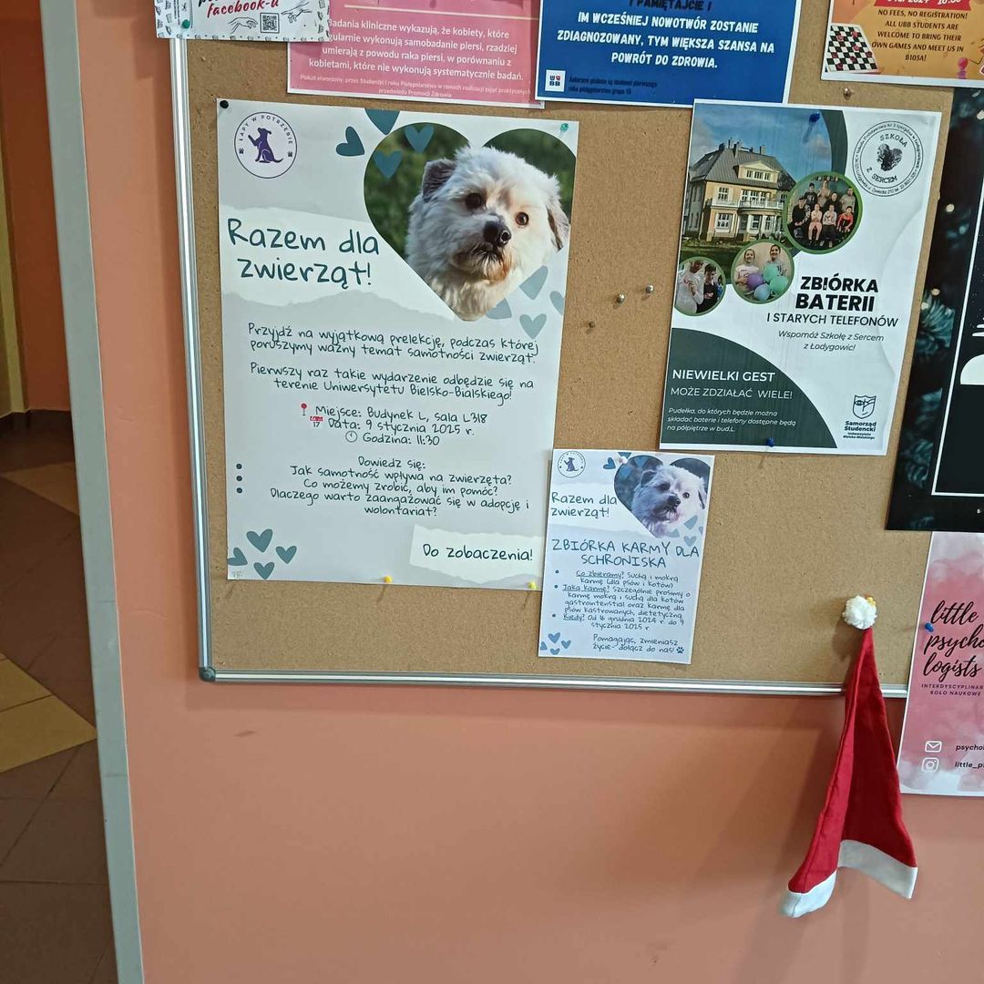 Ich najważniejszym zaplanowanym wydarzeniem była prelekcja na temat bezdomnych zwierząt, która odbyła się 9 stycznia 2025 roku w godzinach 11:30-15:00 w sali L318 tegoż uniwersytetu. W konferencji wzięli udział zaproszeni goście zewnętrzni, którzy przedstawili omawiany problem z ich punktu widzenia, a byli to przedstawiciele Miejskiego Schroniska dla Bezdomnych Zwierząt w Bielsku-Białej, Fundacji Psia Ekipa, Animal-chill oraz Centrum Dogoterapii i Alpakoterapii „Serce Psa i My”, z którego przedstawicielka pani Agnieszka postanowiła przeprowadzić krótki pokaz ze przeszkolonym psem.