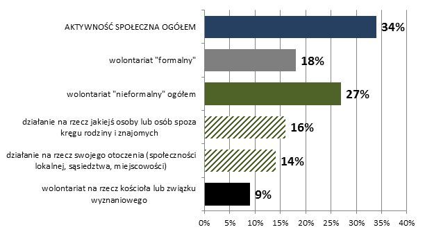 Jeżeli potraktujemy wszystkie typy zaangażowania społecznego łącznie okaże się, że w 2013 roku aktywnych społecznie było 34% Polaków i Polek.