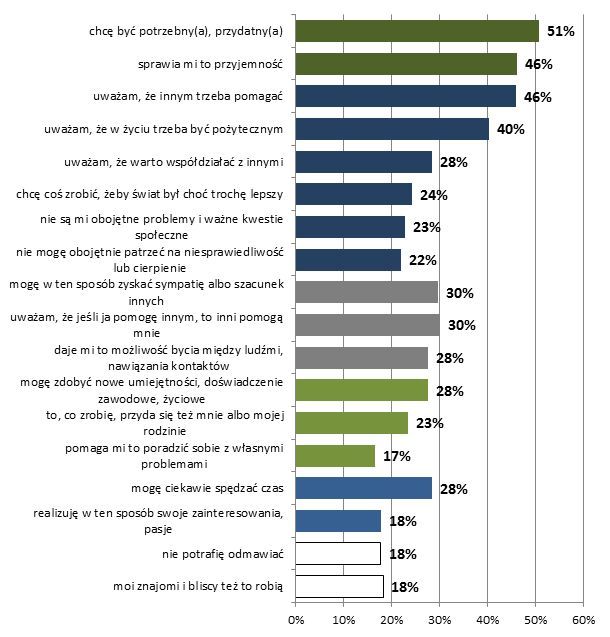Najważniejszą grupą czynników skłaniających społeczników do podejmowania działań na rzecz innych są korzyści psychologiczne wynikające z tego typu aktywności. W sumie wskazało na nie dwie trzecie (66%) z nich: ponad połowa (51%) odpowiedziała, że angażuje się w działalność na rzecz innych osób, ponieważ chce czuć się przydatnymi oraz potrzebnymi, a dla nieco mniej niż połowy (46%) bezpośrednim powodem takiego zaangażowania była natomiast przyjemność, jaką sprawia im tego typu działanie.